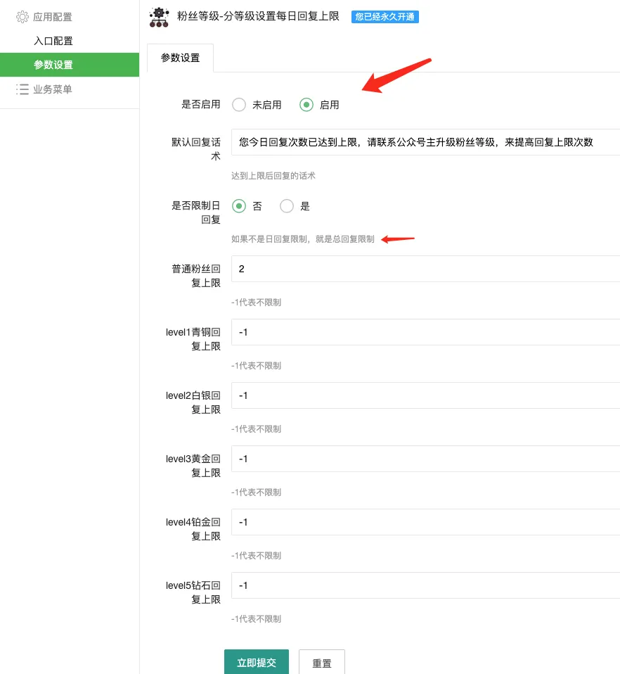 支持设置日回复限制和总回复限制两种模式